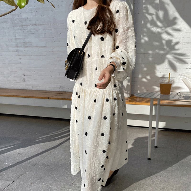 甘い総レースのワンピースに黒のドットがアクセントのロングワンピース
