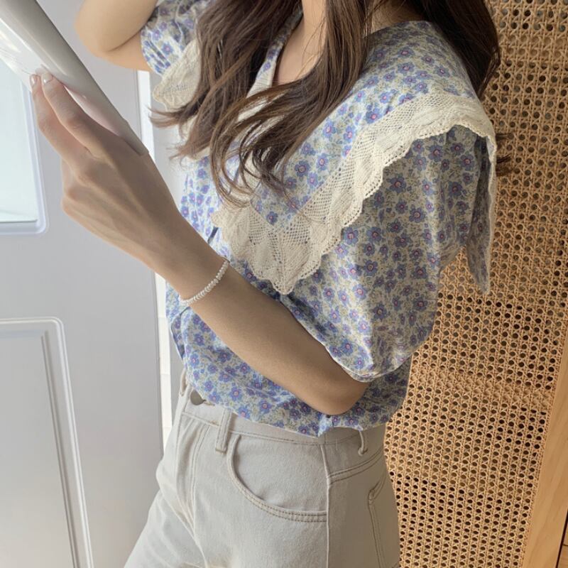 爽やかなブルーカラーの小花柄にレトロチックなレース使いが可愛い
