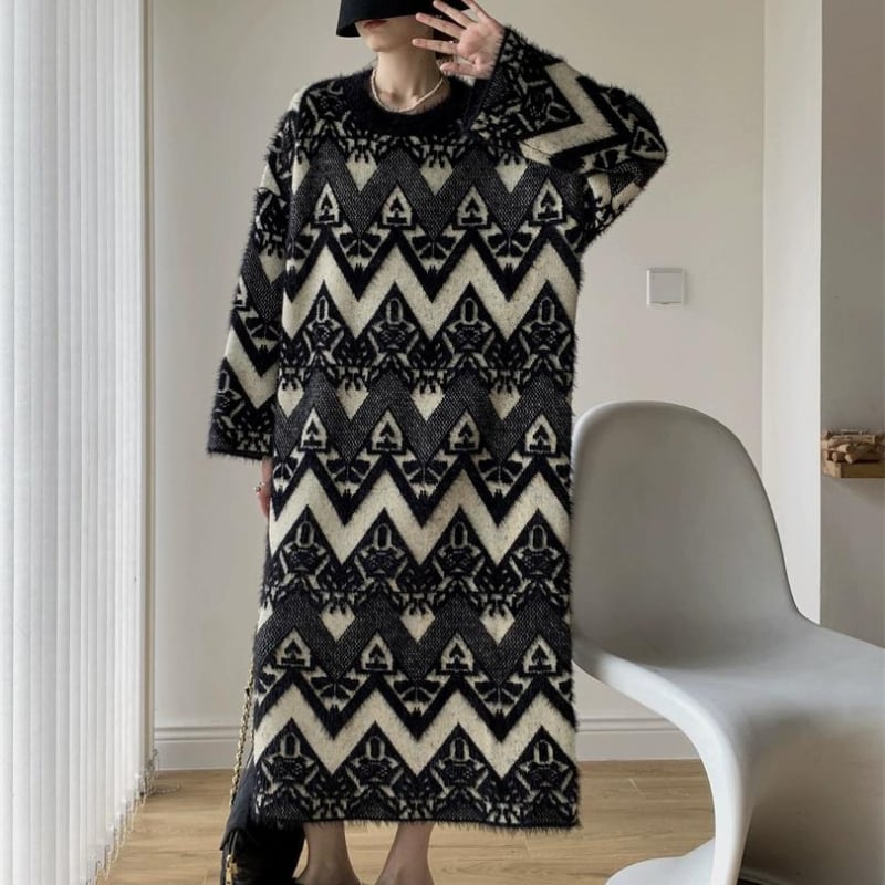 総レース柄ロングニットワンピース R1420