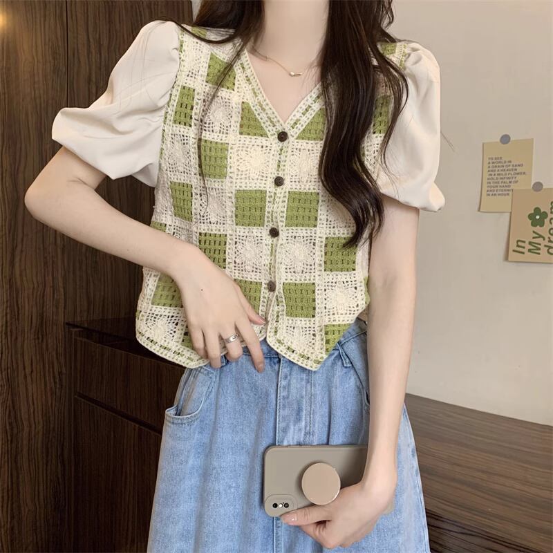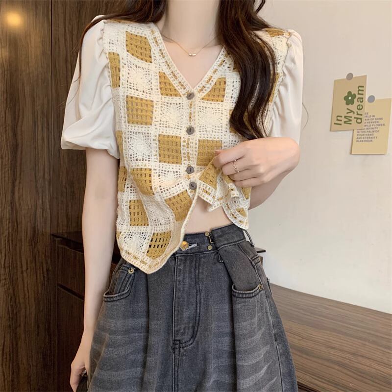 パフスリーブ鍵編みニットドッキングトップス 全4色 R1503